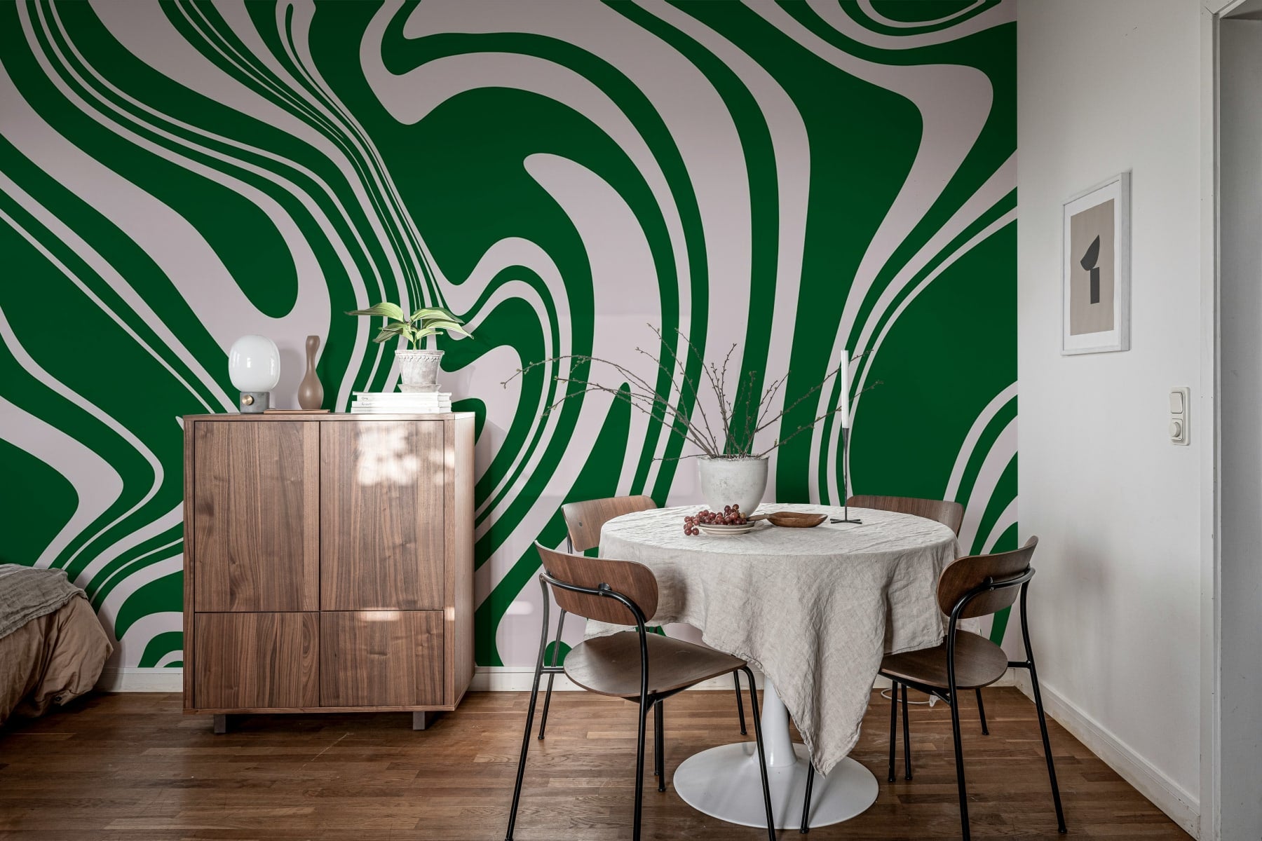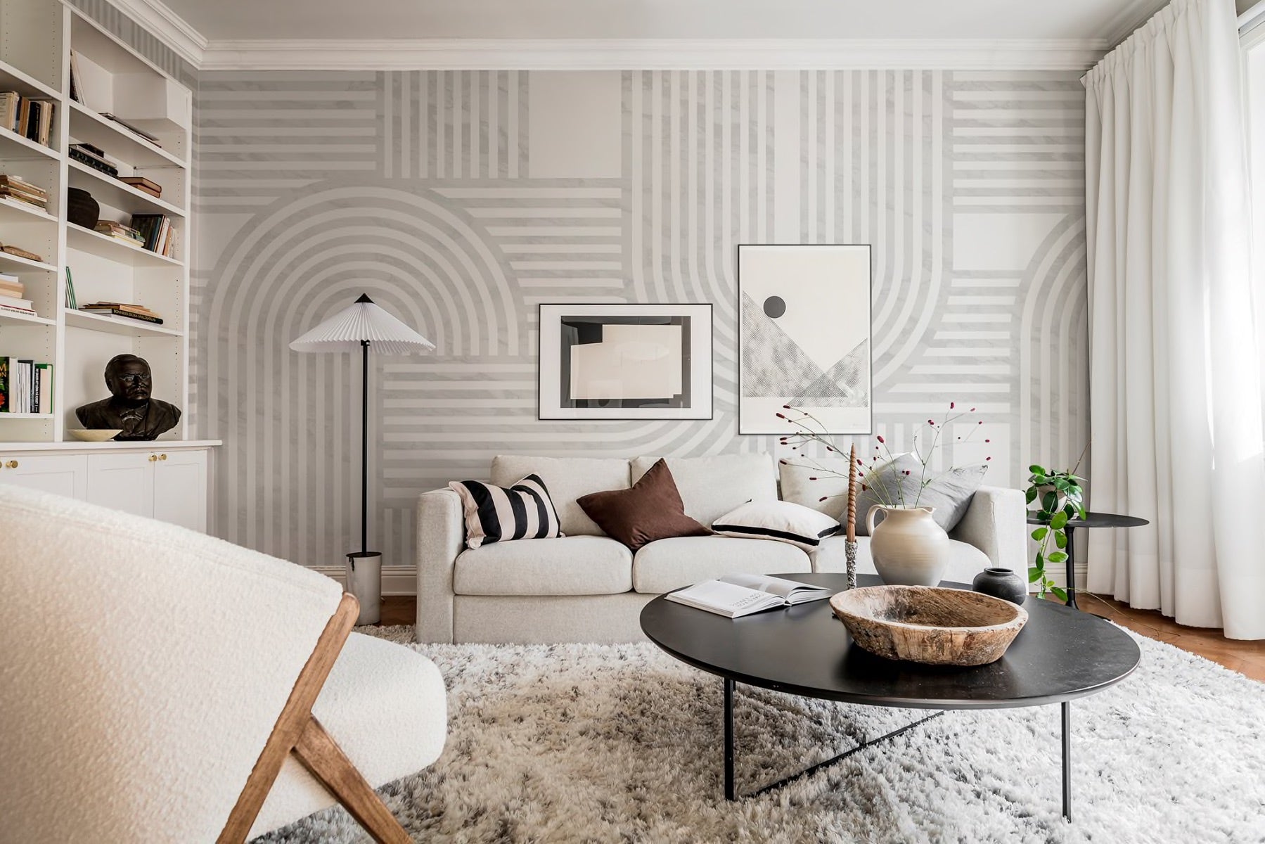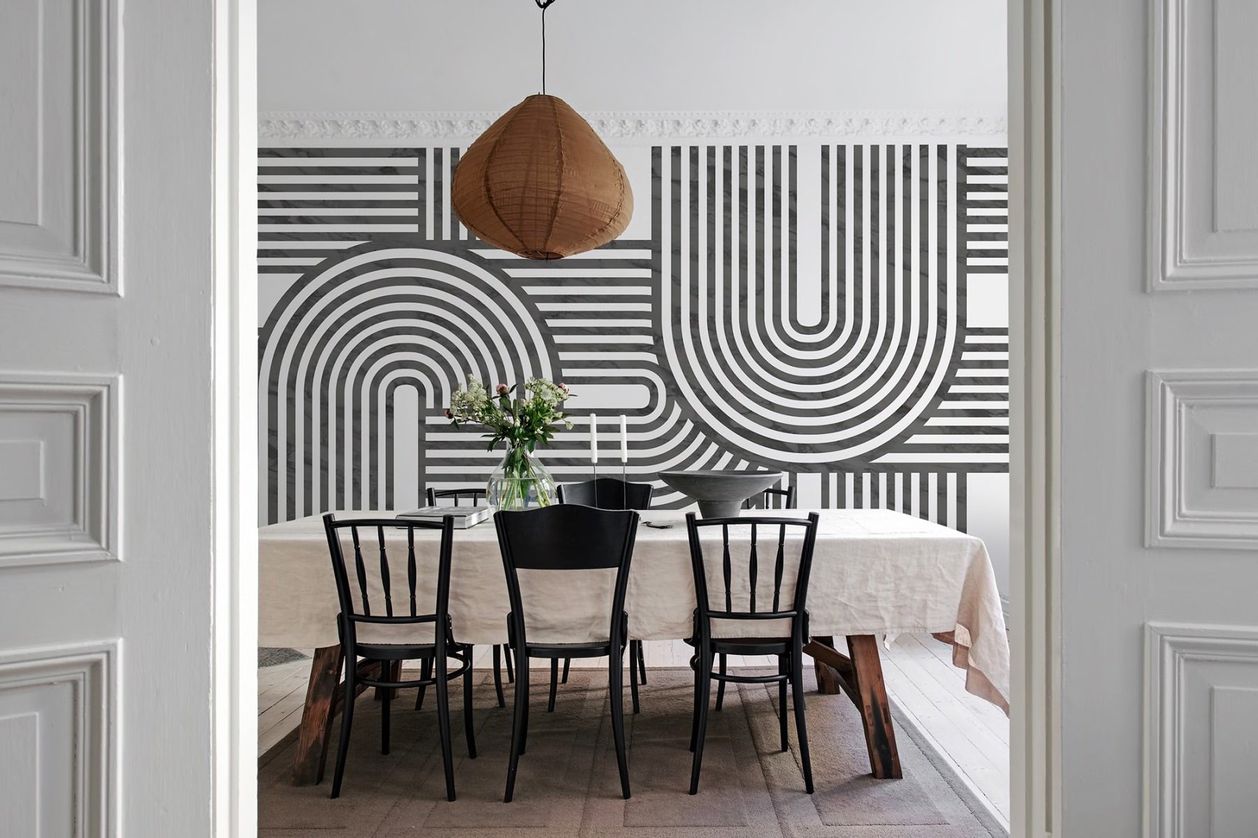 Create a statement with gracefully flowing stripes. Stripes are perfect for setting an organic and artistic atmosphere in your space. The pattern speaks volumes: the beige option displays a beautiful beige backdrop with white lines, the black and white variant provides striking contrast, and the mint choice offers a gentle base highlighted with mint green lines.