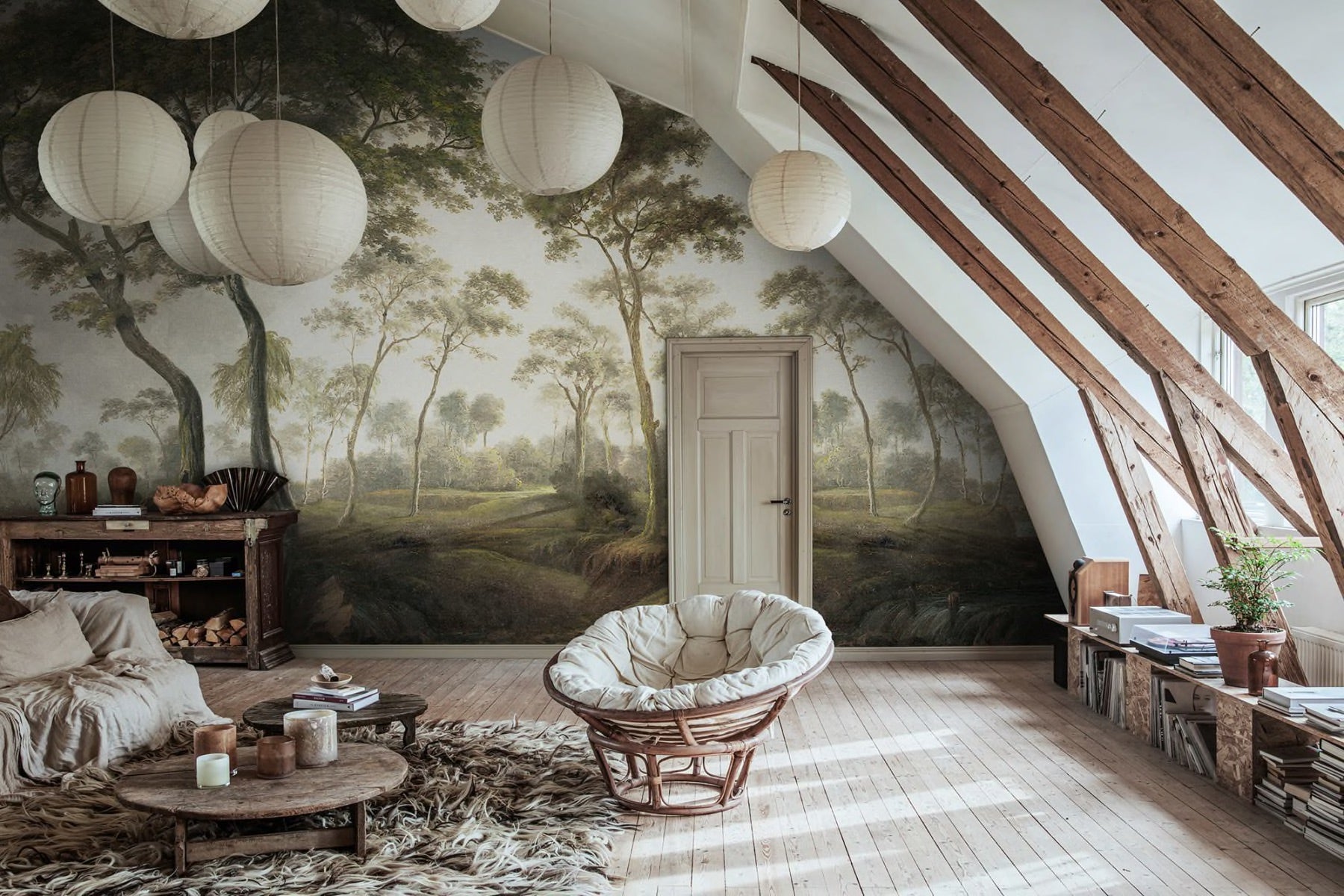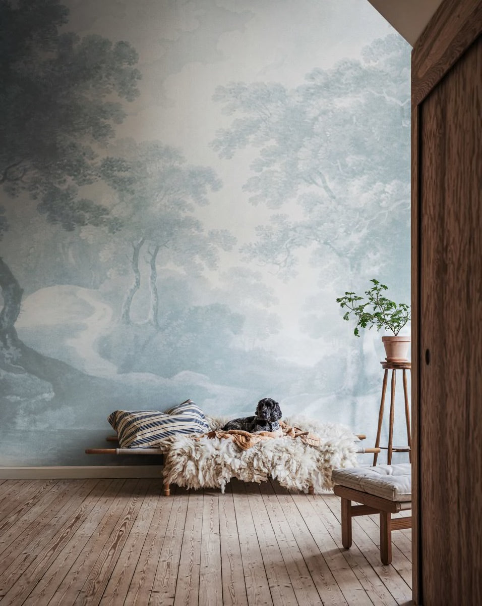 The Green Forest Green wallpaper showcases tranquil beauty through its vibrant forest design in various shades of green. Perfect for bedrooms and living areas, it establishes a calming ambiance highlighted by a gently flowing river. Drawing inspiration from classic art, it features a delightful patina and texture, making it a true gem for any room. Available in two colors: green and vintage blue..