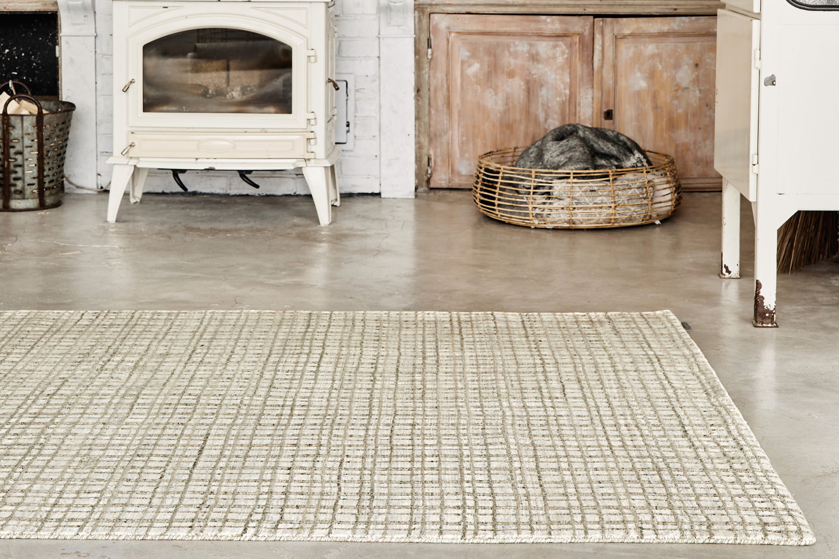 The intersecting lines on the Manhattan rug create a textured graph paper effect, playing with shapes and shades. This rug is made from a blend of 50% New Zealand Wool and 50% Tencel, hand woven by Serge Lesage.